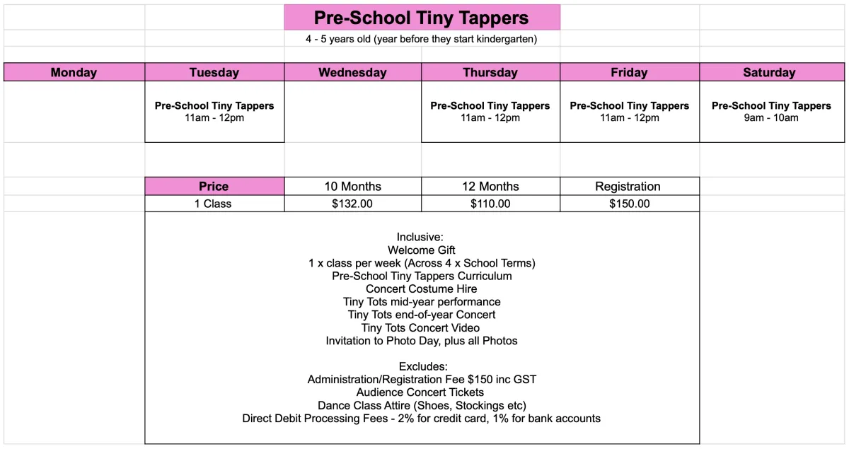 Comprehensive Class Program: Our weekly one-hour classes are designed to introduce the fundamentals of tap dancing, combined with other dance styles, in a way that's engaging and enjoyable for young children.